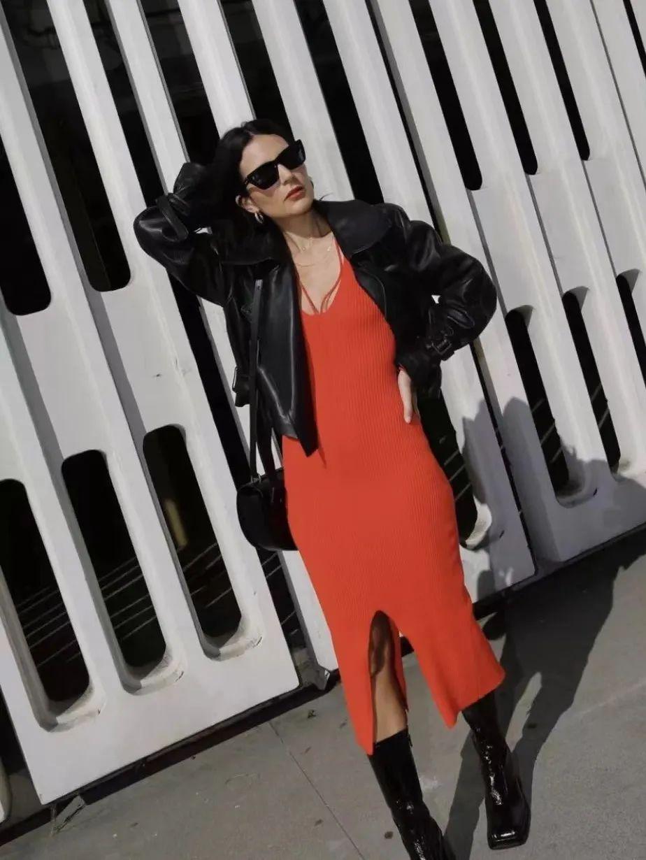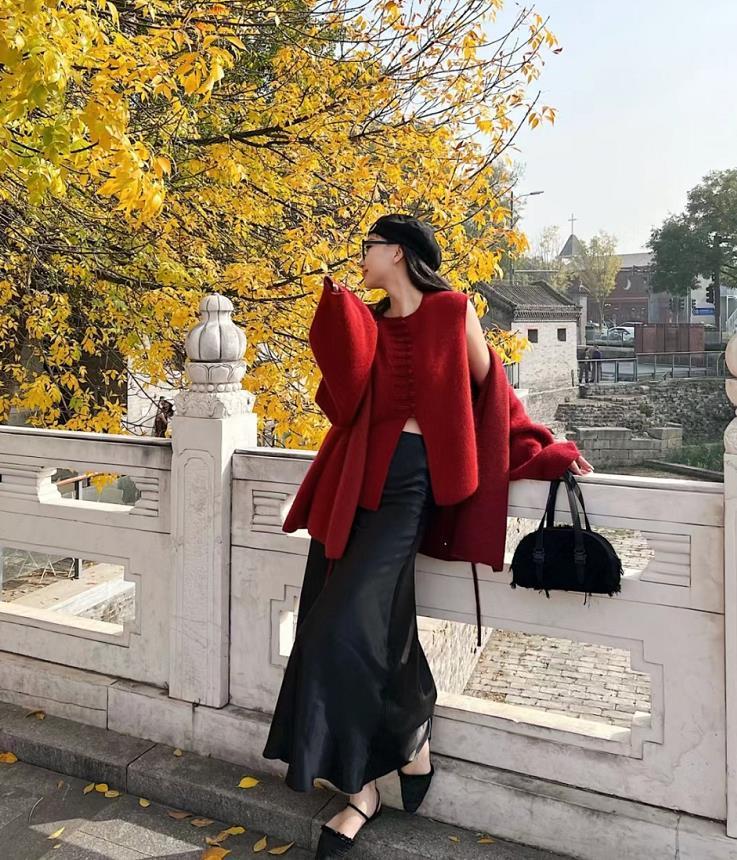 很多姐妹們都覺得紅色容易穿出俗氣感,其實一旦與黑色相配,就能展現出高級感。紅色針織開衫+黑色開叉半裙+短靴,一整個氣質優雅。