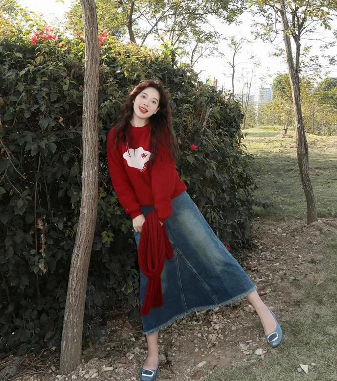 新年穿紅色真的好看,這個色系是帶點暗紅,不會太張揚,穿起來很洋氣喜慶,選擇牛仔半身裙來配,少女範十足。