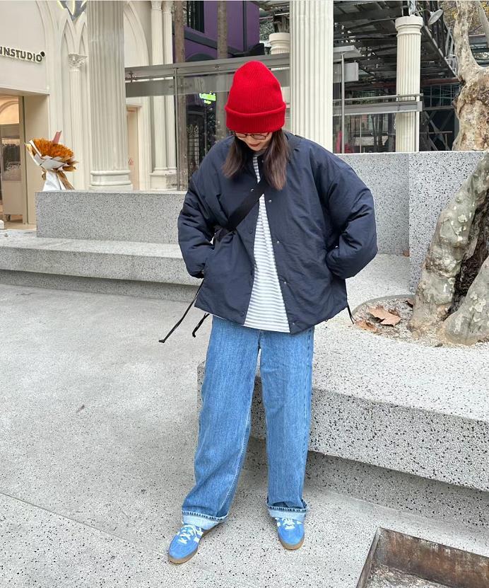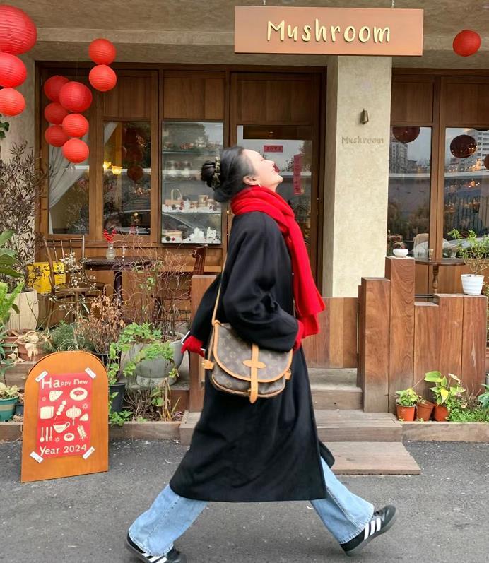 黑色+紅色+牛仔藍,很經典時髦的配色,一抹紅色的圍巾點綴,將新年的氛圍感營造出來。
