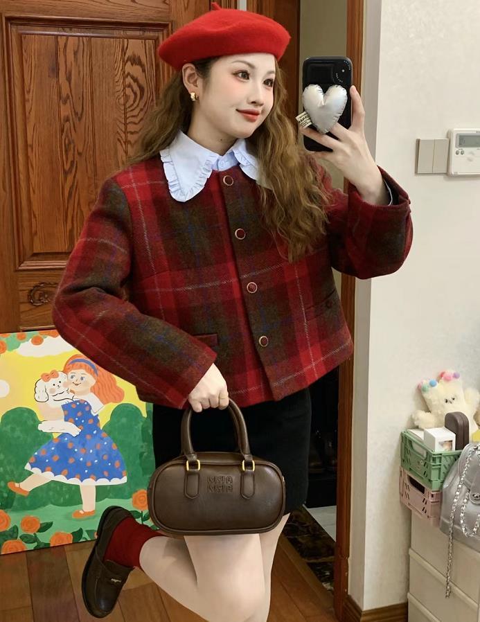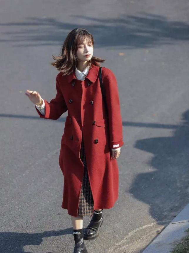 大過年的又怎能少了紅色呢?不喜歡太鮮豔的紅,可以選擇暗紅色,紅色格紋外套,利落的短款,穿起來輕鬆顯高。