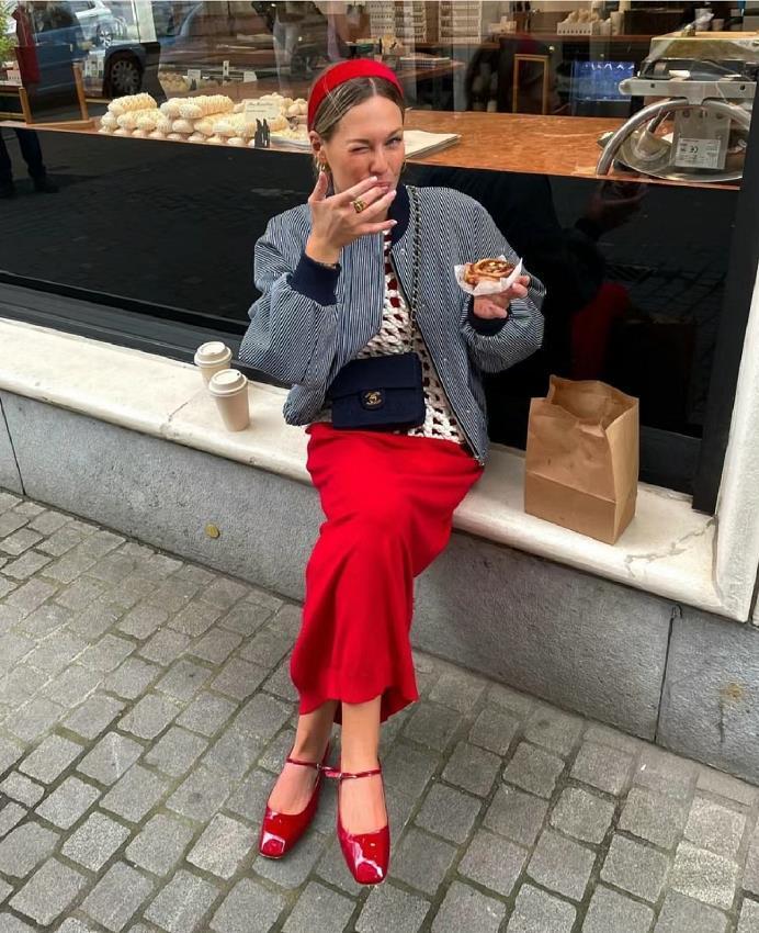 外套+半身長裙,春天這麼穿正好,紅色緞面裙+瑪麗珍單鞋,和諧又時髦,裙子和鞋子顏色一致,輕鬆拉長腿部線條。