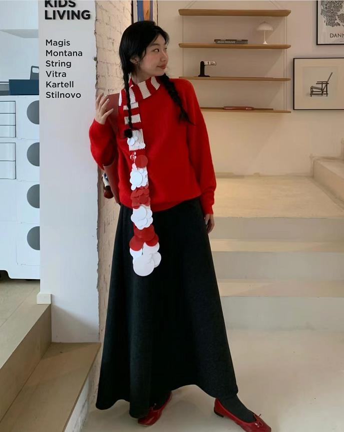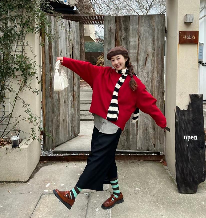 紅色毛衣是真的好好看啊,最適合新年穿了,現在溫度回升起來,出門單穿就可以。在裏面疊穿一件白色裙子,露出來的裙襬,很顯層次又不失文藝。
