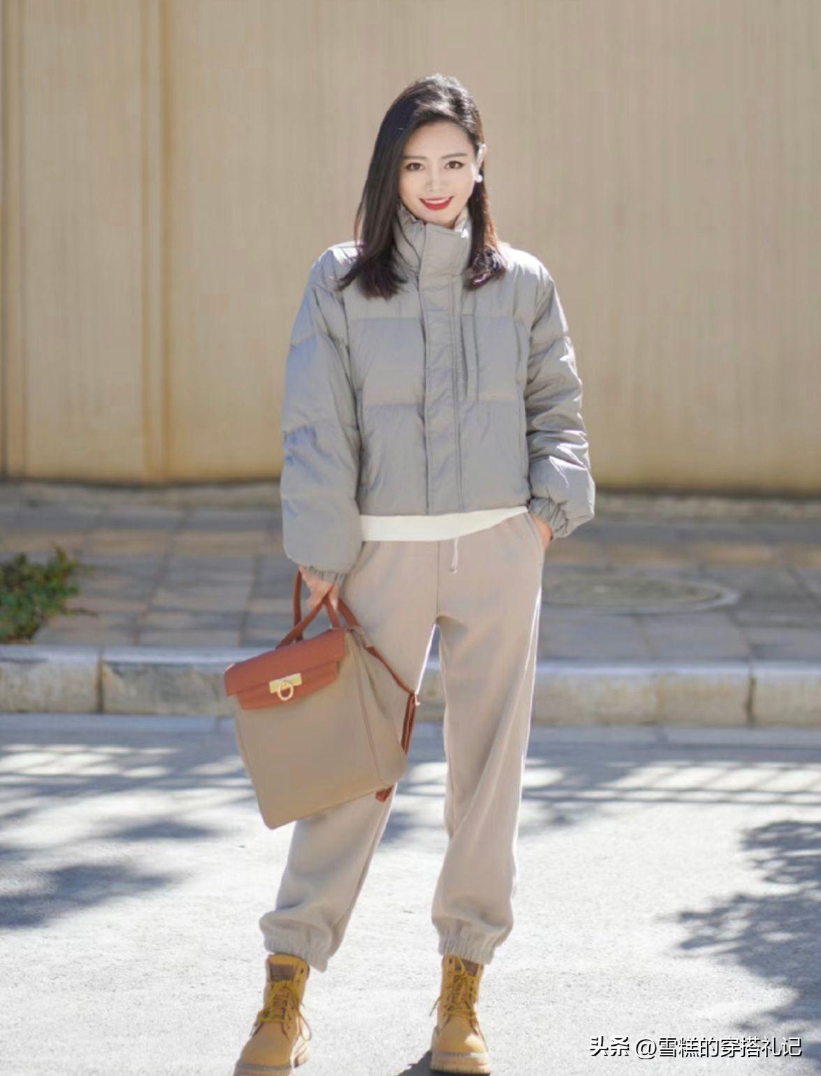 運動褲我們選擇了高腰的版型狀態,那麼在這個時候就推薦各位小個子的女性一定要將上短下長的版型穿搭都直接營造出來。上半身就可以選擇短款的羽絨服或者是棉服與其進行結合,這個時候所搭配的運動褲最好就是可以拖地的版型,因爲對於我們的腿型縱向長度有着很明顯的拉伸能力。