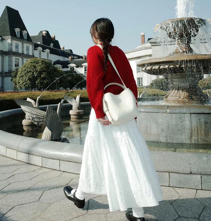 紅白的搭配,也是絕了,基礎款紅色毛衣+白色半身長裙,一整個仙氣感十足。