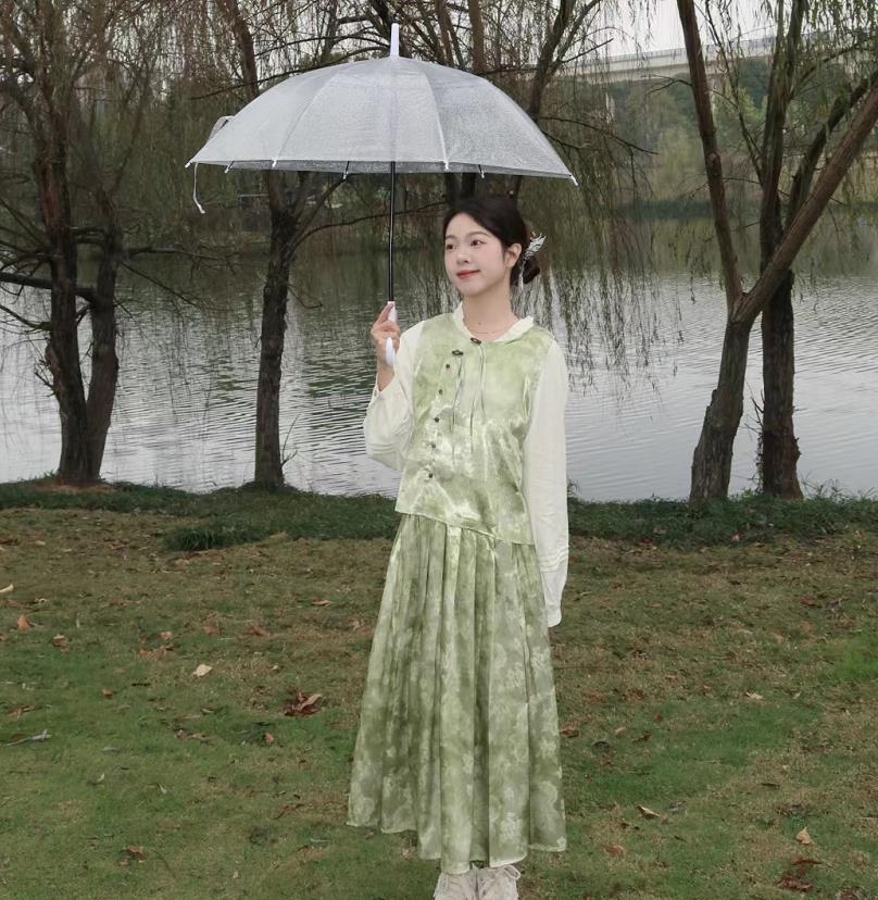 這套是新中式套裝哦,對於懶得在搭配上花費時間的姐妹來說,就可以選擇套裝,很方便省心。清新感十足的色調,在春天溫度回暖後換上就對了。