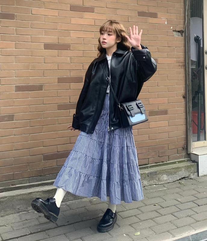 搭配格子半身長裙,又多了幾分小文藝的氣息,腳下黑色的鞋子與皮衣進行呼應,和諧感十足。