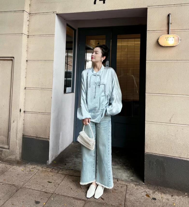 一旦入了新中式的坑,只會越陷越深,過年的穿搭,說什麼也要入手一兩件,冰川藍色上衣,與牛仔直筒褲的組合,時髦減齡又不失氣質。