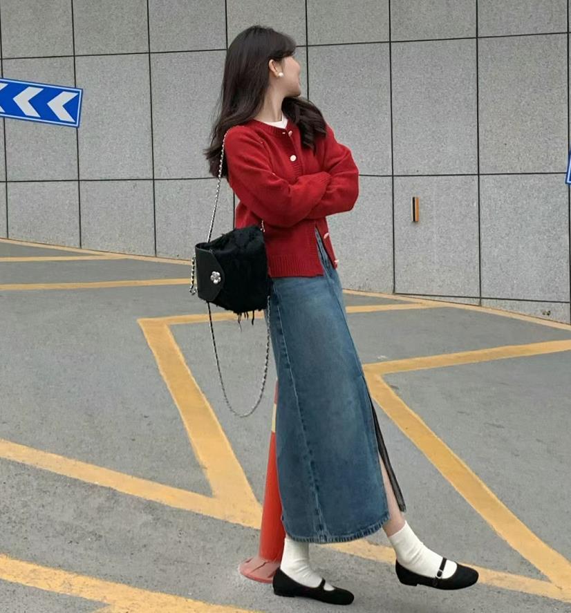 有時候簡簡單單的穿搭就是很耐看時髦,上短下長的組合,輕鬆優化整個身材比例,顯高挑又能拉長腿部線條。紅色短毛衣+牛仔開叉半裙,超級減齡,少女範十足。