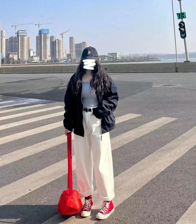 腳下踩着的紅色帆布鞋,很好點亮了整個造型,時髦洋氣極了。