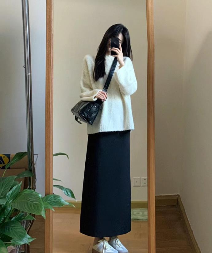 簡簡單單就很好看,黑白配色,有種很極簡的範,軟糯舒適的白色毛衣,與黑色直筒半身長裙相配,超級顯瘦時髦。