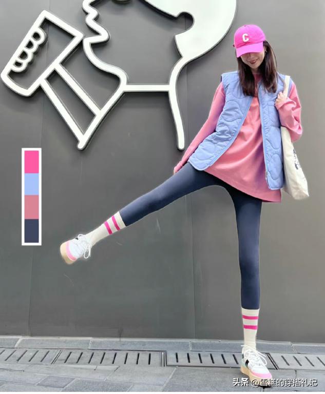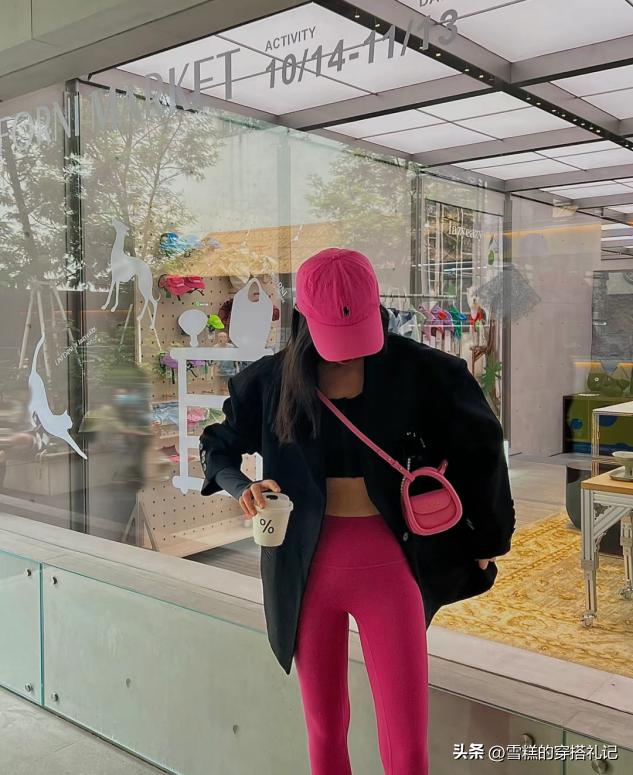 如果不想整體過於花哨,也可以將亮色都集中在一個位置,如這種粉色衛衣配粉色棒球帽,全部的亮色都集中在上半身下半身,反而以簡約基礎色爲主上下結合反而更襯托出高級感。