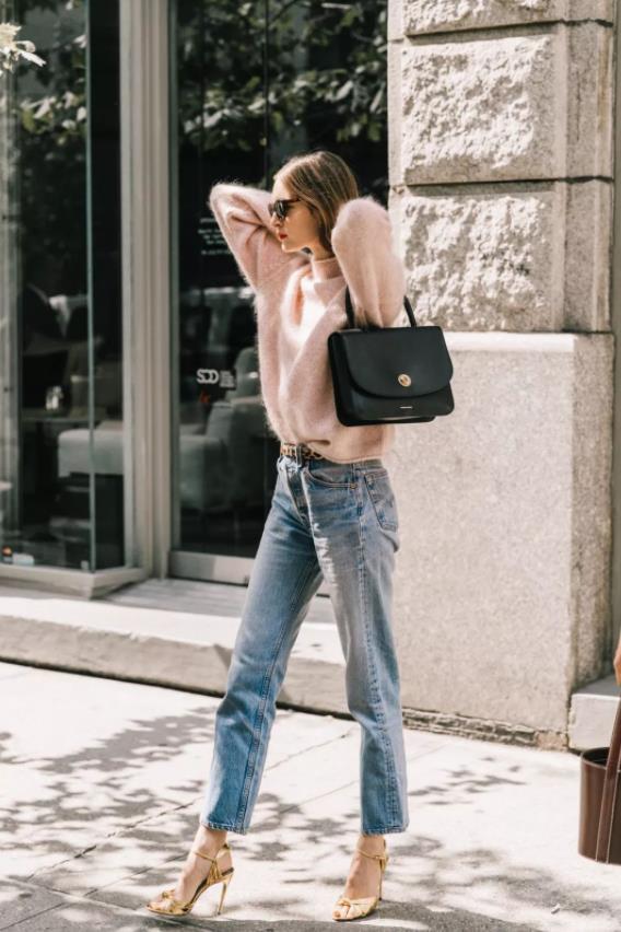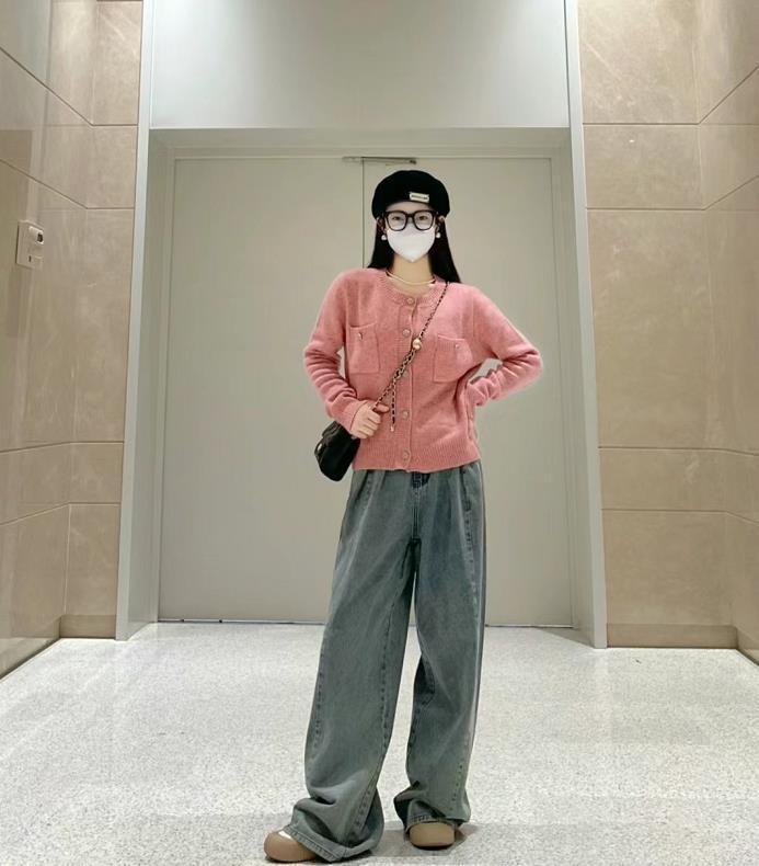 這套太減齡了吧,感覺都年輕好幾歲,粉嫩的毛衣開衫,瞧着就很乖,甜美感十足,配牛仔闊腿拖地褲,慵懶少女範就打造了。