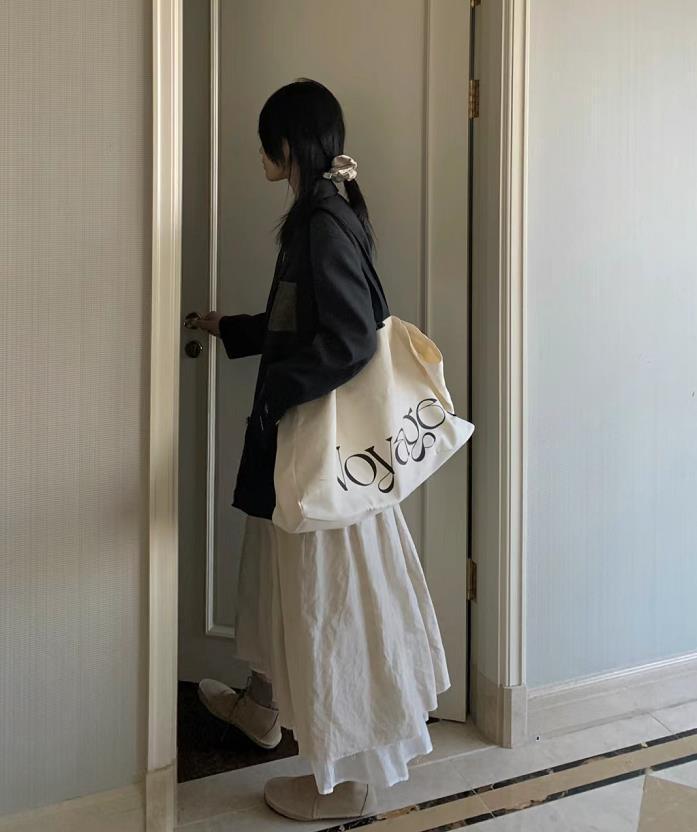 米白色寬鬆闊腿褲,上下的版型都是帶點鬆弛感的,隨性又自在。