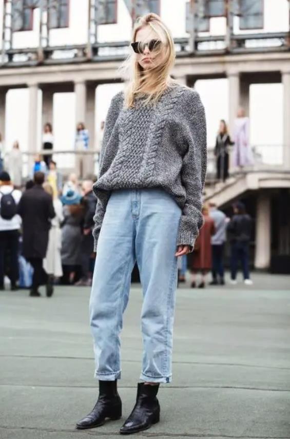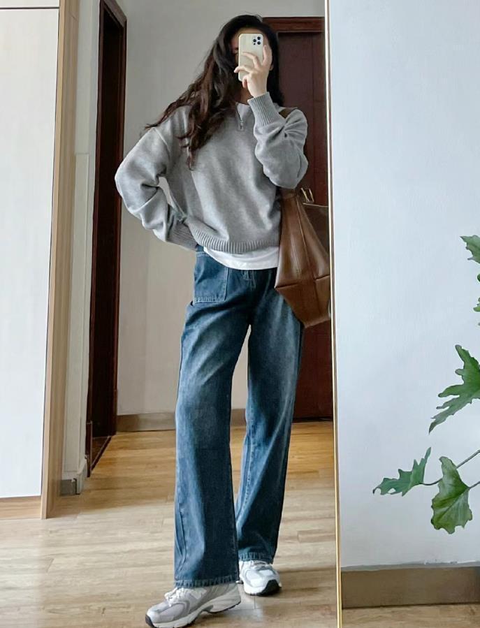 還是這種簡單休閒的穿搭最自在啊,高級灰毛衣+白色t,疊穿就是時髦太多了,應對早春的溫度也足夠了。直筒牛仔褲,休閒隨性,還顯瘦。