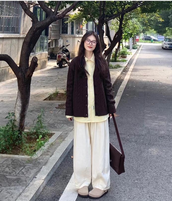 韓系復古範的一套,深咖色的毛衣開衫,建議內搭結合淺色或亮色的打底,襯衫或t恤都行。