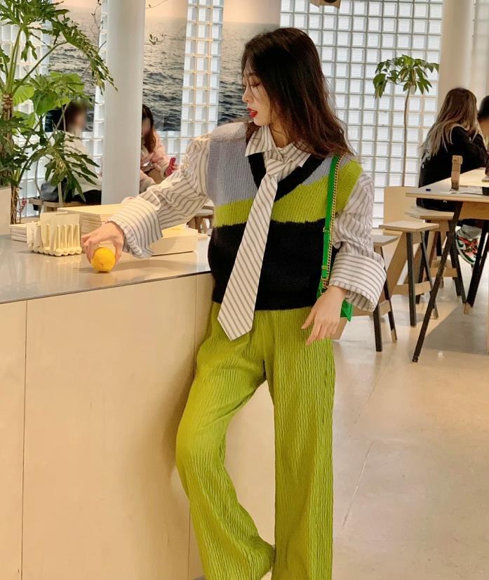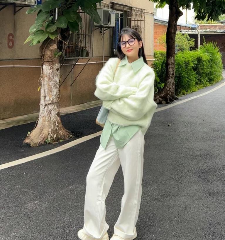 毛衣軟糯,顏色是那種很特別的嫩綠,無敵顯白,疊穿襯衫,又減齡還顯層次。