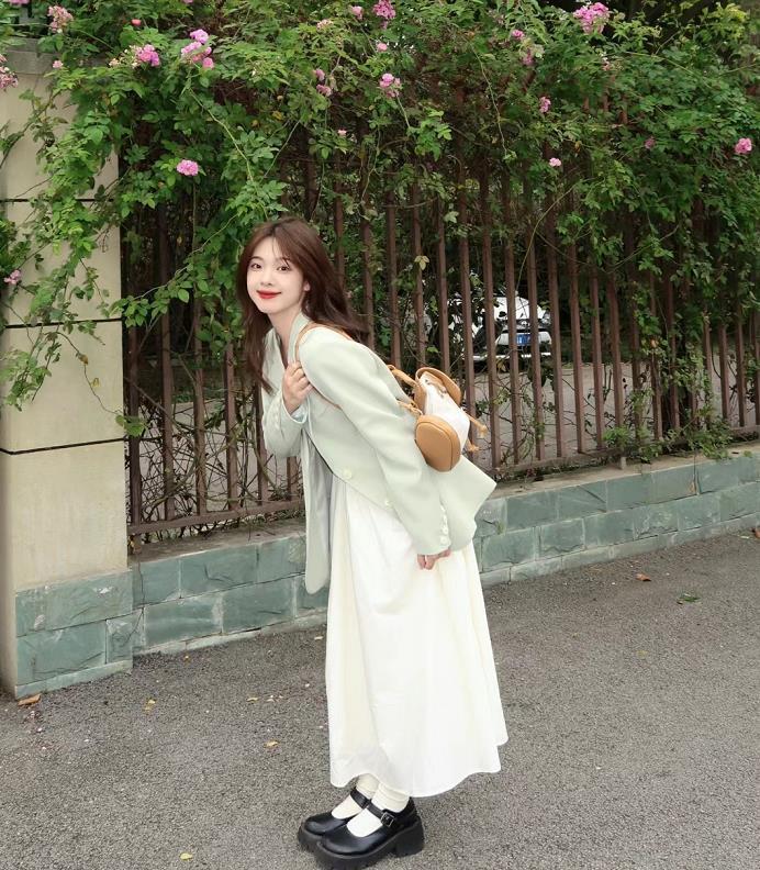 綠色西裝配白色長裙,有讓人眼前一亮的既視感,淺淺的綠色,穿起來可顯溫柔了,很襯膚色。