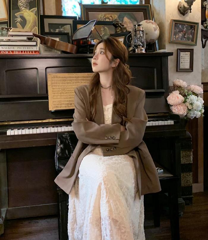 對棕色的西裝真的沒法拒絕啊,整體看起來就很有氣質的一套,蕾絲連衣裙,自帶溫柔與浪漫氣息,咱就說,這一套仙氣感十足。