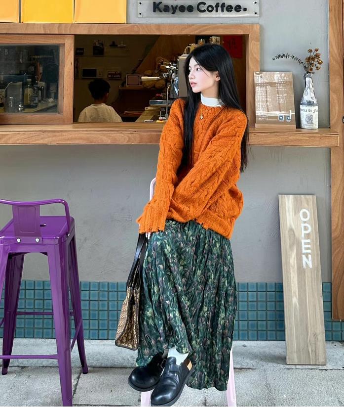 明媚又鮮豔的橘色毛衣,在春天穿起來一點問題都沒有,建議在裏面疊穿件白高領打底,這樣才能打造出層次感。碎花裙的結合,將浪漫氣息進行到底。