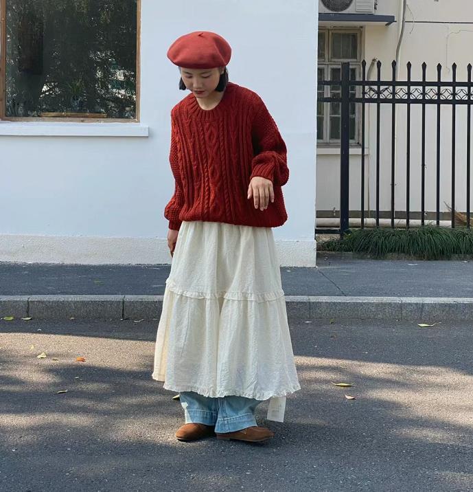 新春佳節,紅色的毛衣穿起來也太喜慶洋氣了,粗麻花材質,質感很好,穿起來也非常保暖。下身進行了疊穿,裙子+牛仔褲,看似有些不倫不類的搭配,其實卻很有範。