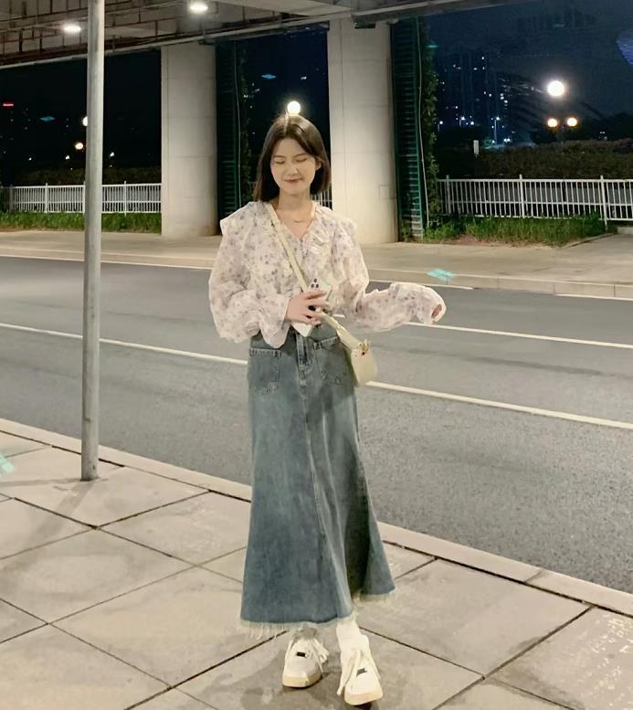 這一套是真的好溫柔啊,好喜歡,顏色很素雅的碎花雪紡襯衫,搭配牛仔半身長裙,一整個被溫柔住了,淑女範十足。