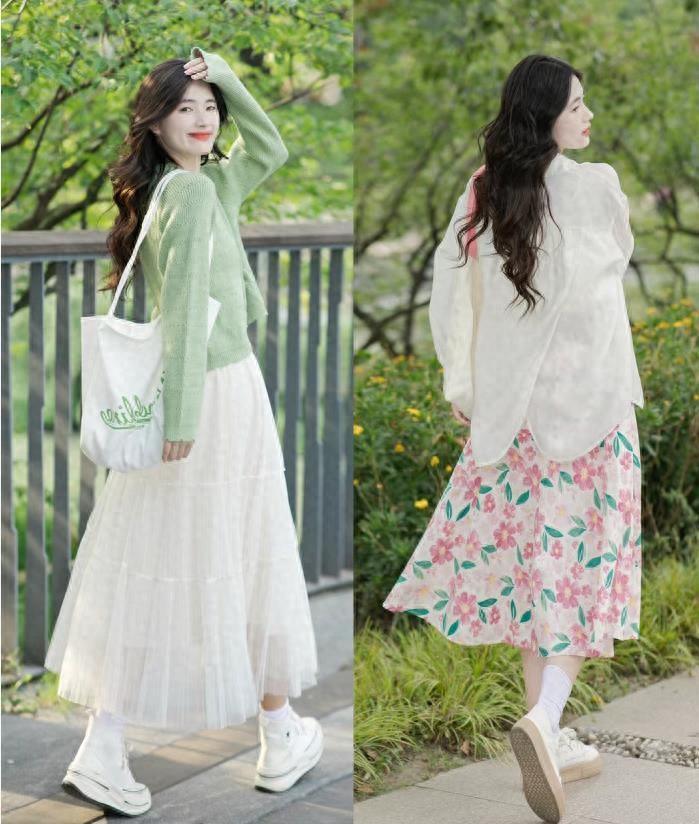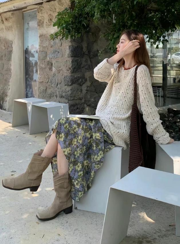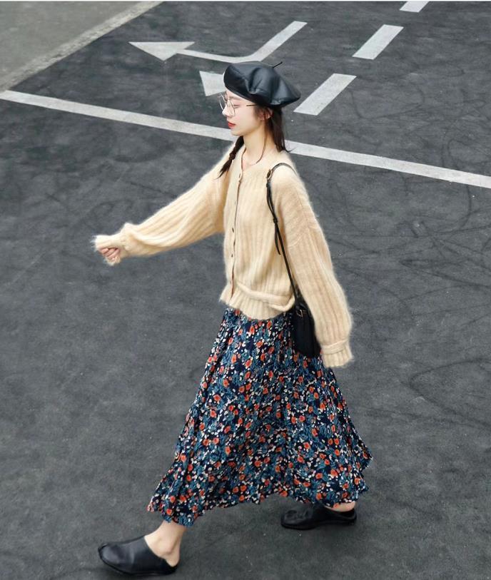 純色毛衣+花裙子,太美了,南方的姐妹們,春天回暖就這麼穿就行,裙子的顏色超級清新脫俗,不管是單穿疊穿都完美。