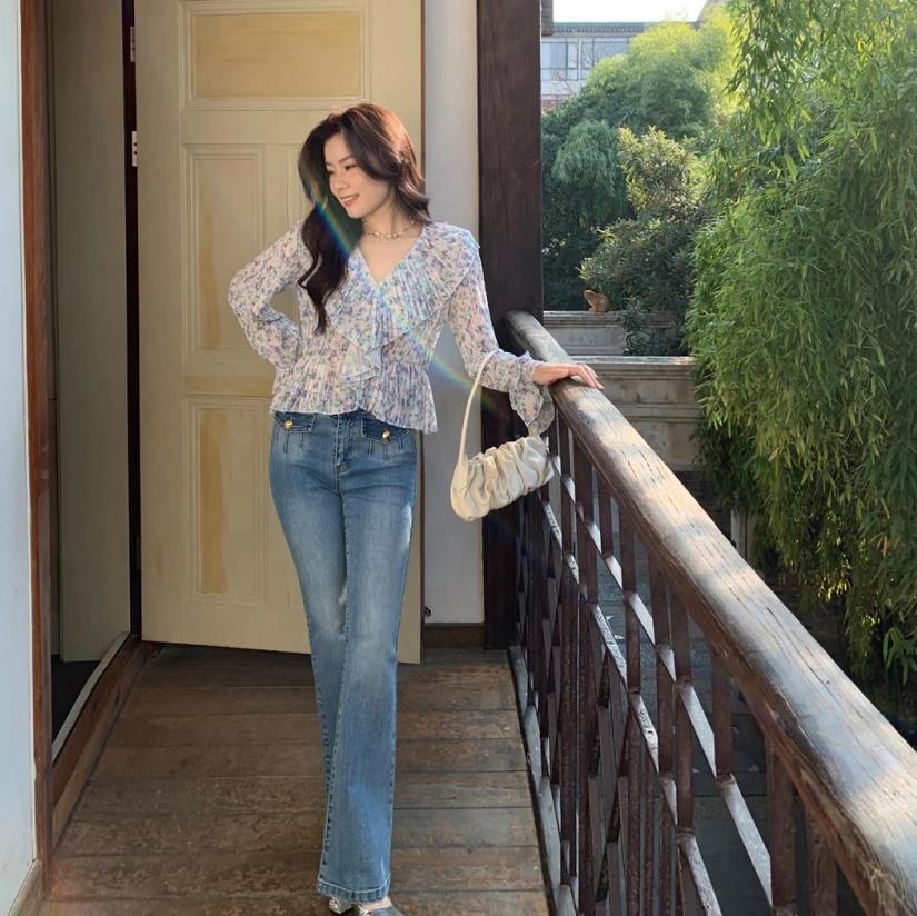 春天就是要穿花上衣啊,這件碎花小衫,衣服整體都是皺褶的設計,穿起來超顯瘦的,搭配藍色牛仔微喇褲,高級感滿滿,還十分有氣質。