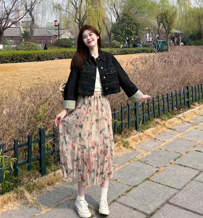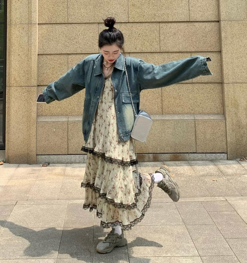 復古牛仔外套+碎花裙,簡單又好看的穿搭,在春天就是要選擇花裙子來穿,出門遊玩和逛街都很合適。鞋子的話,配一雙運動鞋或帆布鞋就行。