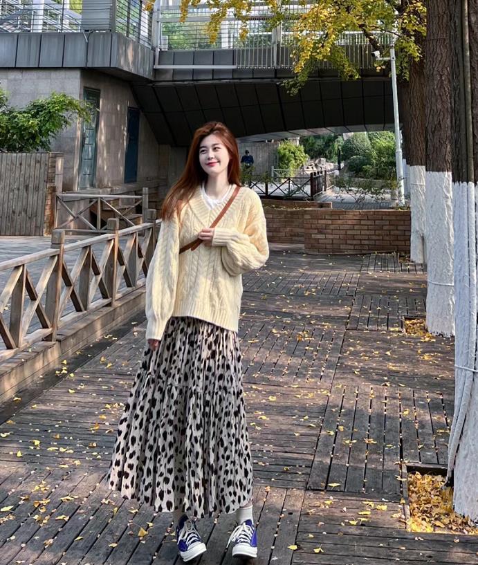 春天的花裙子,真的是意外好看啊,裙子的顏色並沒有太花裏胡哨的,上衣選擇一件淺色毛衣來配,遵循簡繁的組合,就是好看沒道理。