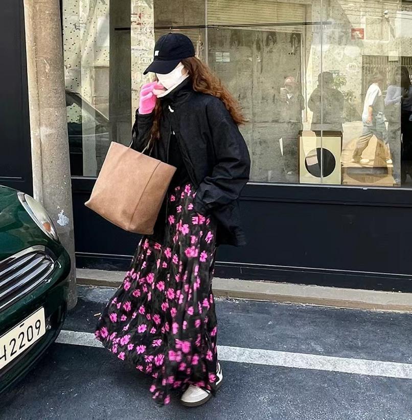 與印花半身長裙組合在一起,上簡下繁,輕鬆打造出層次感,浪漫極了。