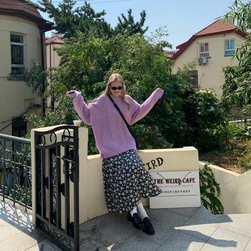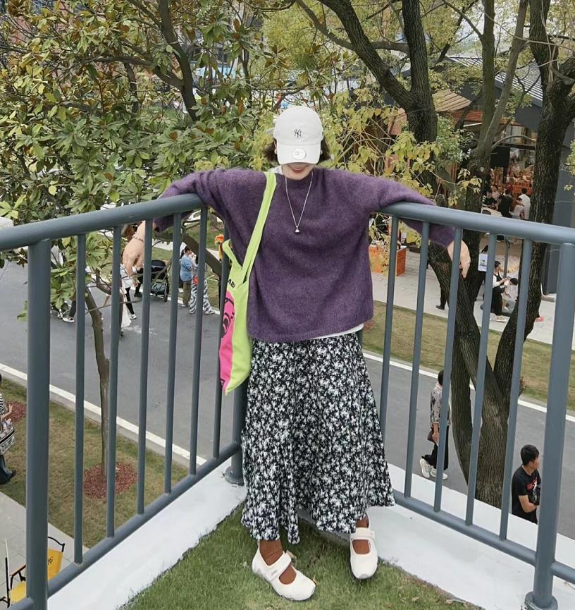 毛衣的顏色也太美了吧,粉紫色的毛衣,很顯白很嫩,寬鬆的版型,穿得舒適自在又顯瘦。結合起碎花半裙,浪漫又好看。