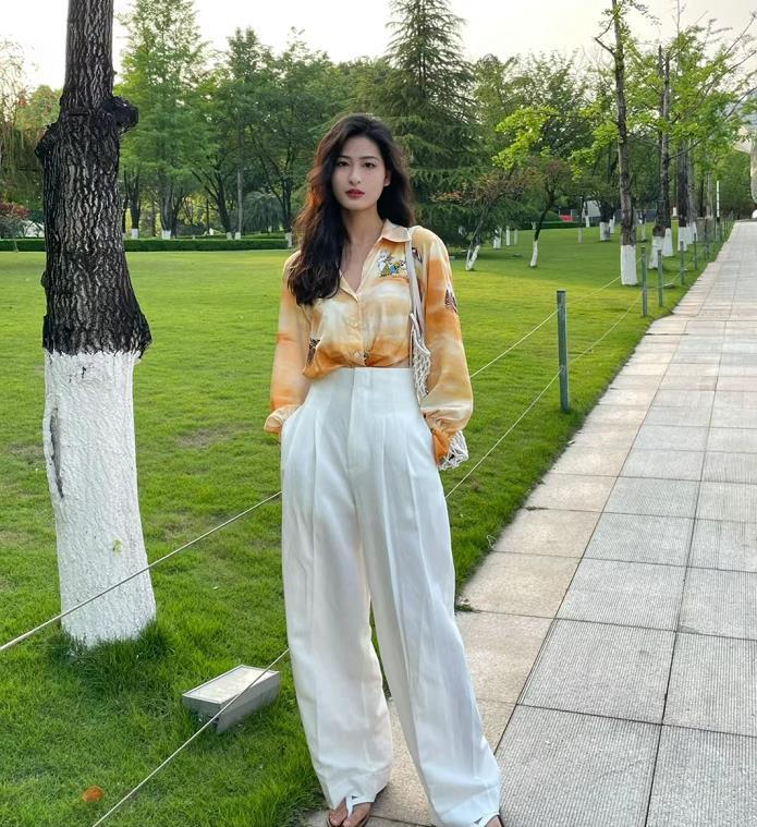 黃色花襯衫看起來很有春夏的味道,不管是春天,還是夏天都能穿,與白色拖地褲相配,整體瞧着就很清爽又舒服。