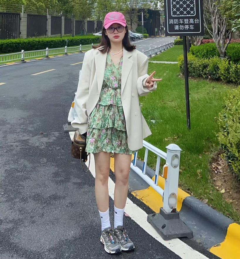 西裝+花裙子,就是春天的氣息啊,在微涼的早晨和夜晚,增加一件薄外套正好,寬鬆版型的奶白色西裝,對身材有着極佳的包容性。再混搭一雙運動鞋就更舒適自在了。