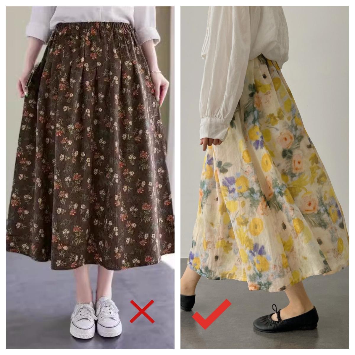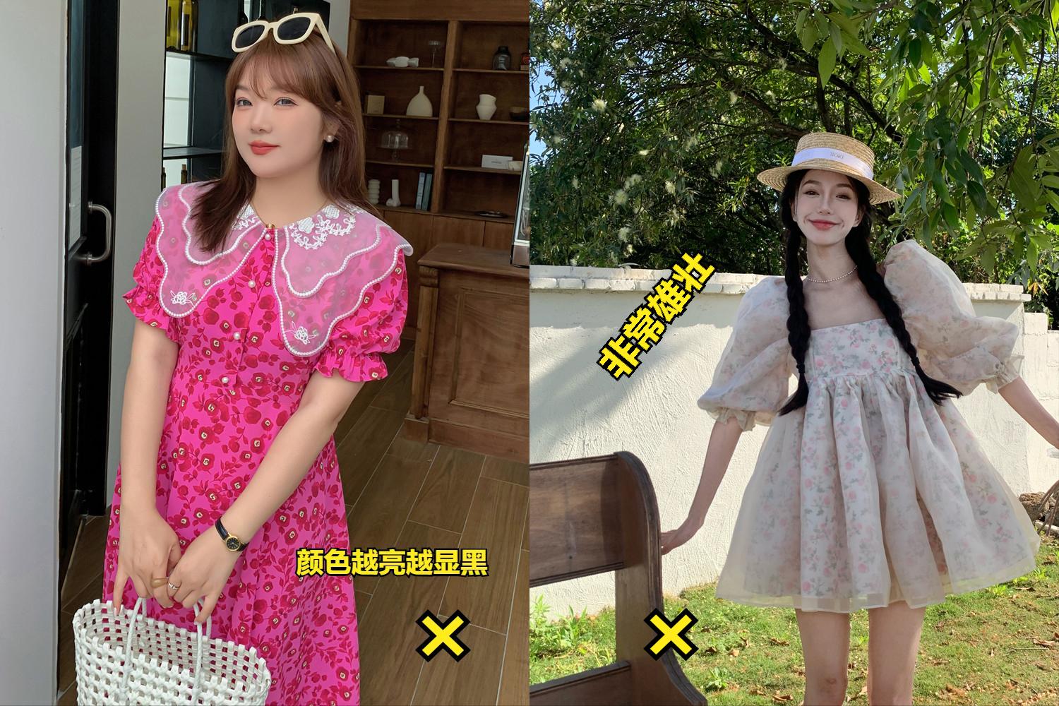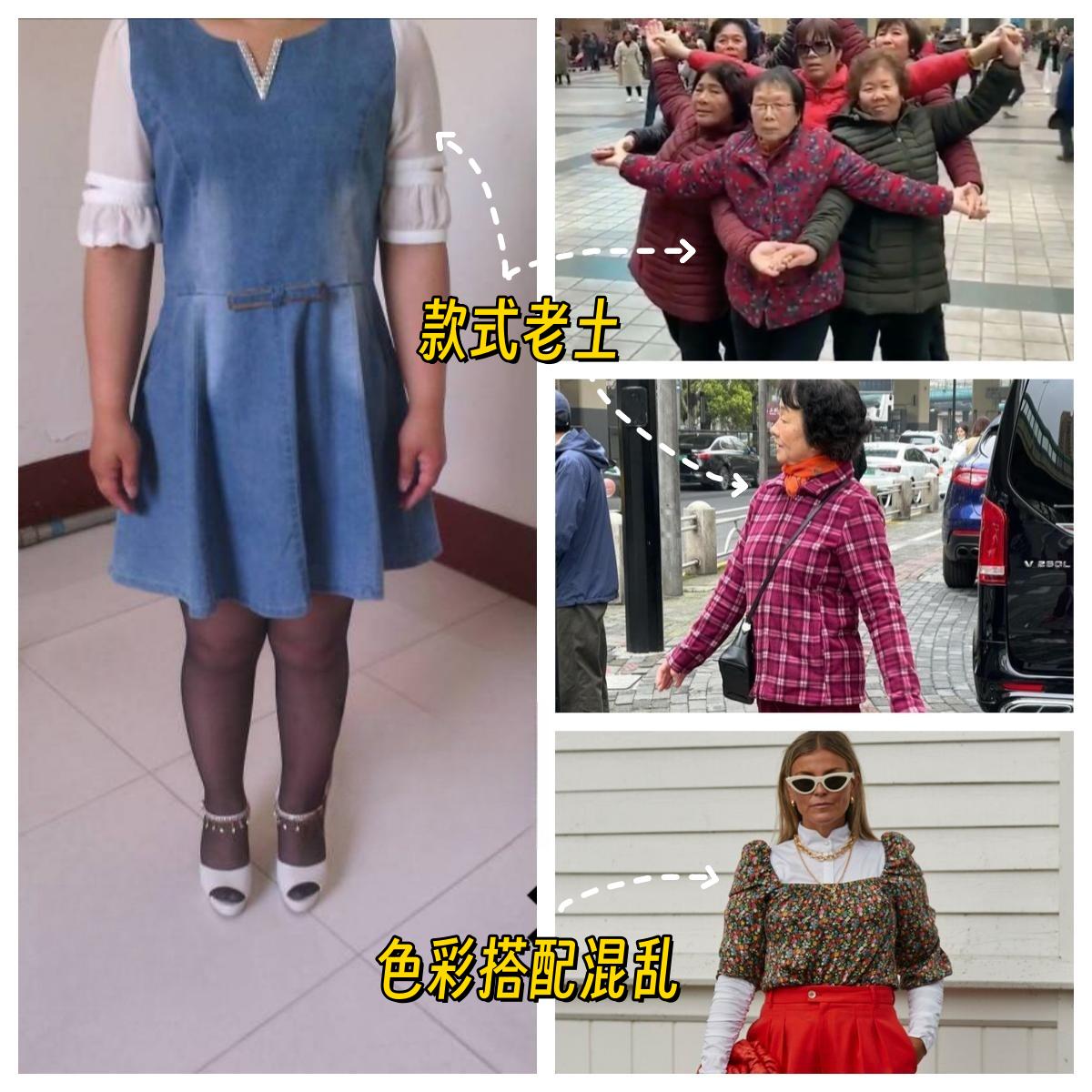 繁雜又鮮豔的碎花裙、高飽和度的撞色穿搭,視覺上看很凌亂,容易顯得土氣,且對於中年女性來講,這樣的穿着很容易拉胯氣質。