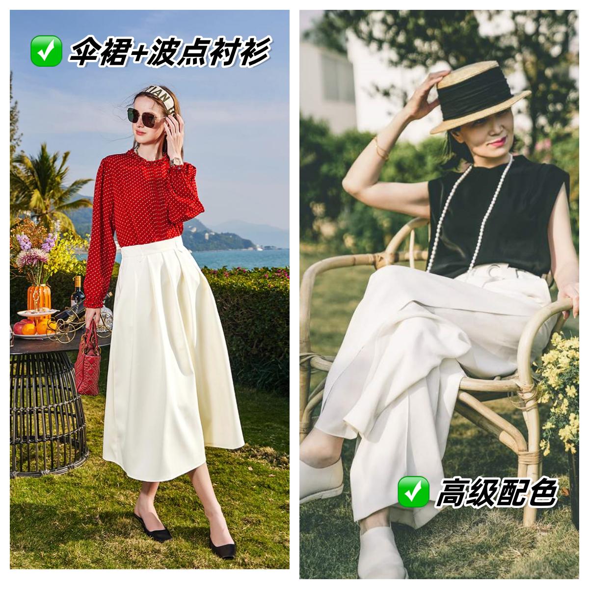 V 領上衣+闊腿褲、A 字裙或傘裙,拉長腿部比例,讓身材看起來更加高挑。