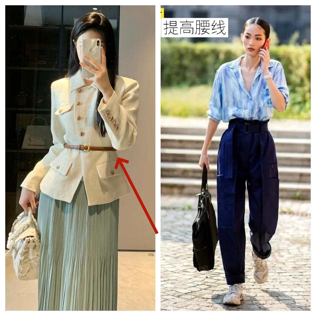 除了鞋子外,無論是微胖還是纖瘦,穿衣打扮上要努力提高腰線,高腰褲、高腰裙、腰帶等,總之能營造好的比例的單品都安排起來,都屬於小個子必備的增高款式。比如短款上衣+高腰直筒褲,營造大長腿的感覺,從而拉長下半身的比例。