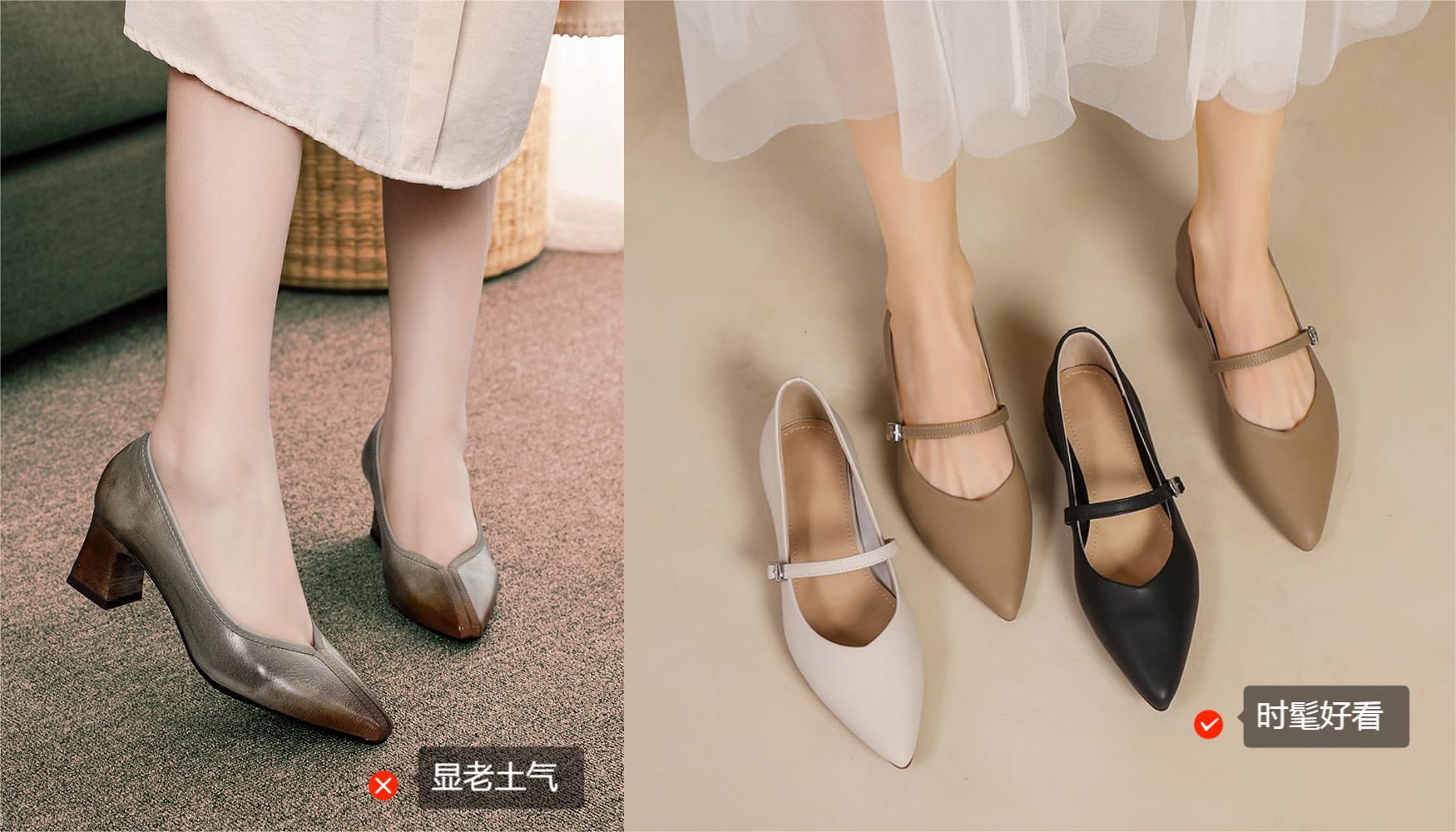 這種粗跟、小貓跟的鞋子,裸色的款式可以拉長腿部比例,讓身材看起來更加高挑。長筒靴也不錯,不需要很高,但是也能起到顯高的作用。