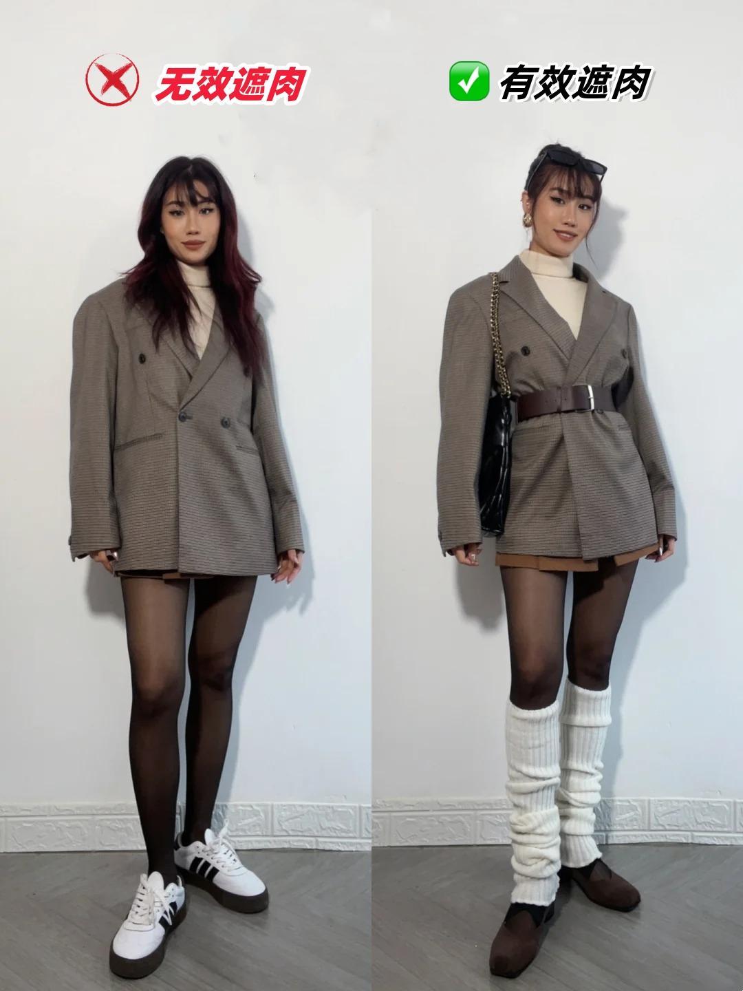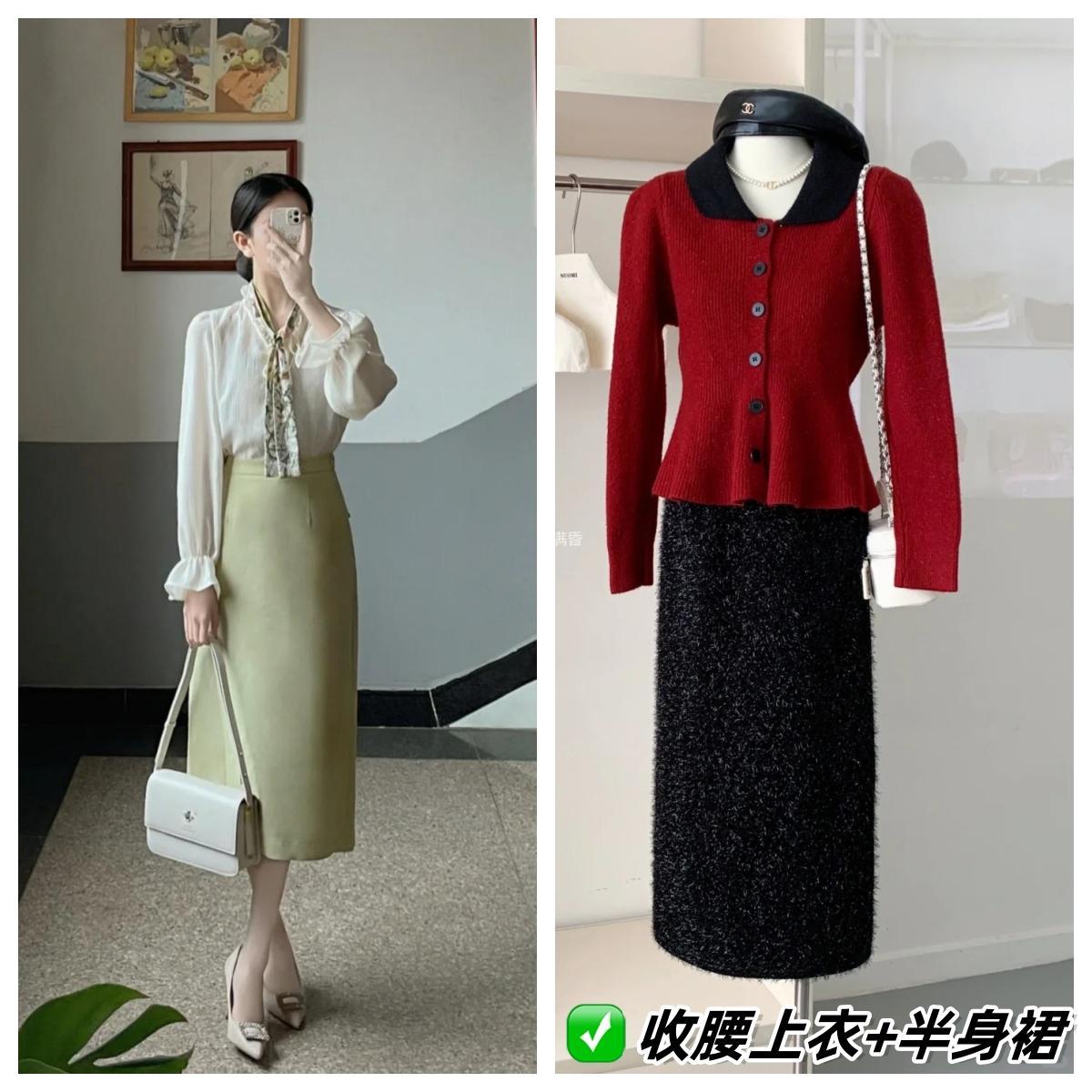 通過疊穿遮蓋上半身的不足之處。推薦收腰上衣+半身裙的穿搭方式,很遮肉顯瘦。