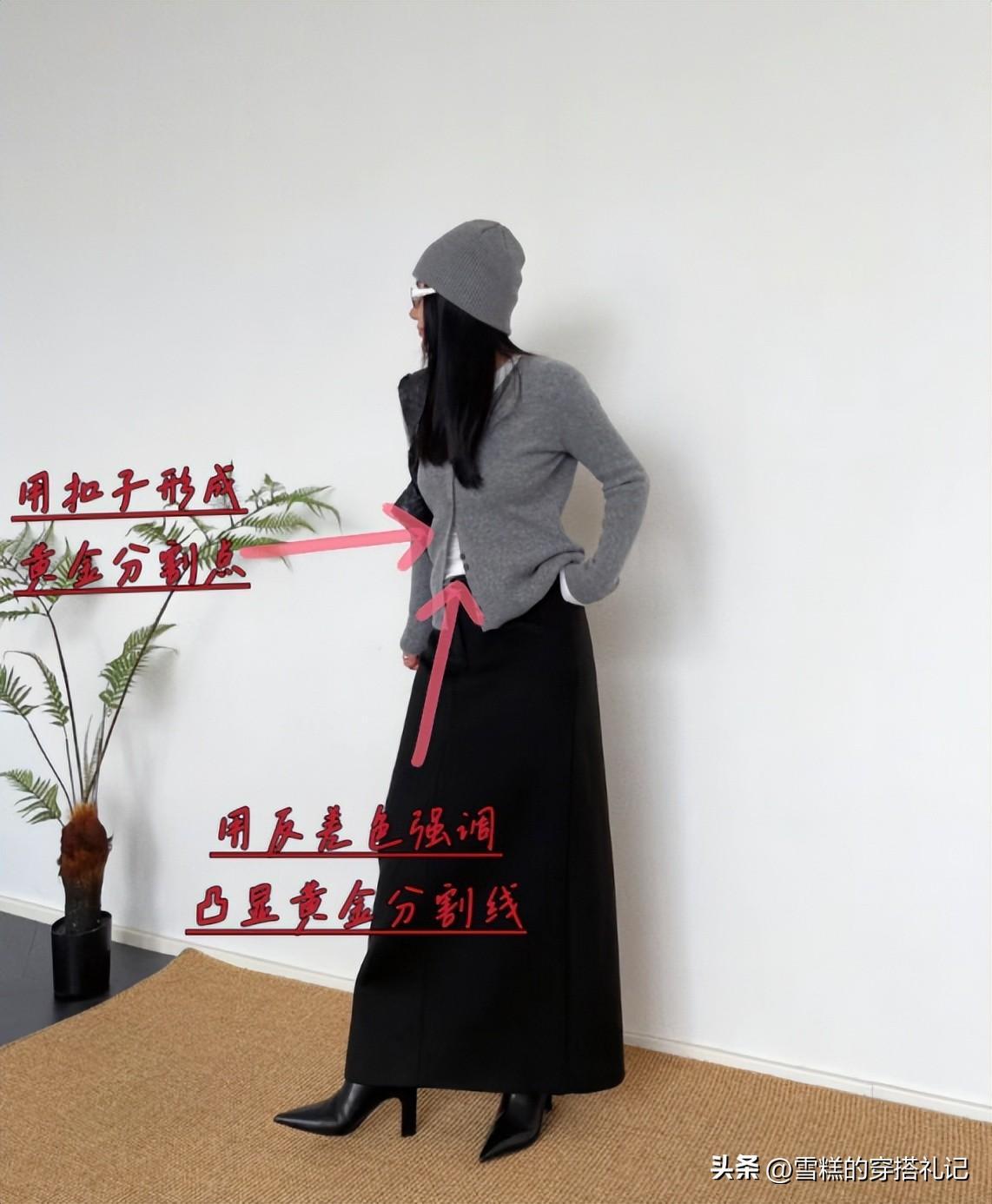 因此想要展現黃金分割比例就要學會利用“點線面”,在我們穿開衫時,把下面兩個釦子空出來,讓最後扣上那個釦子成爲黃金分割點,再利用和開衫顏色有對比的內搭來襯托點,這樣穿既鬆弛還能塑造好比例。