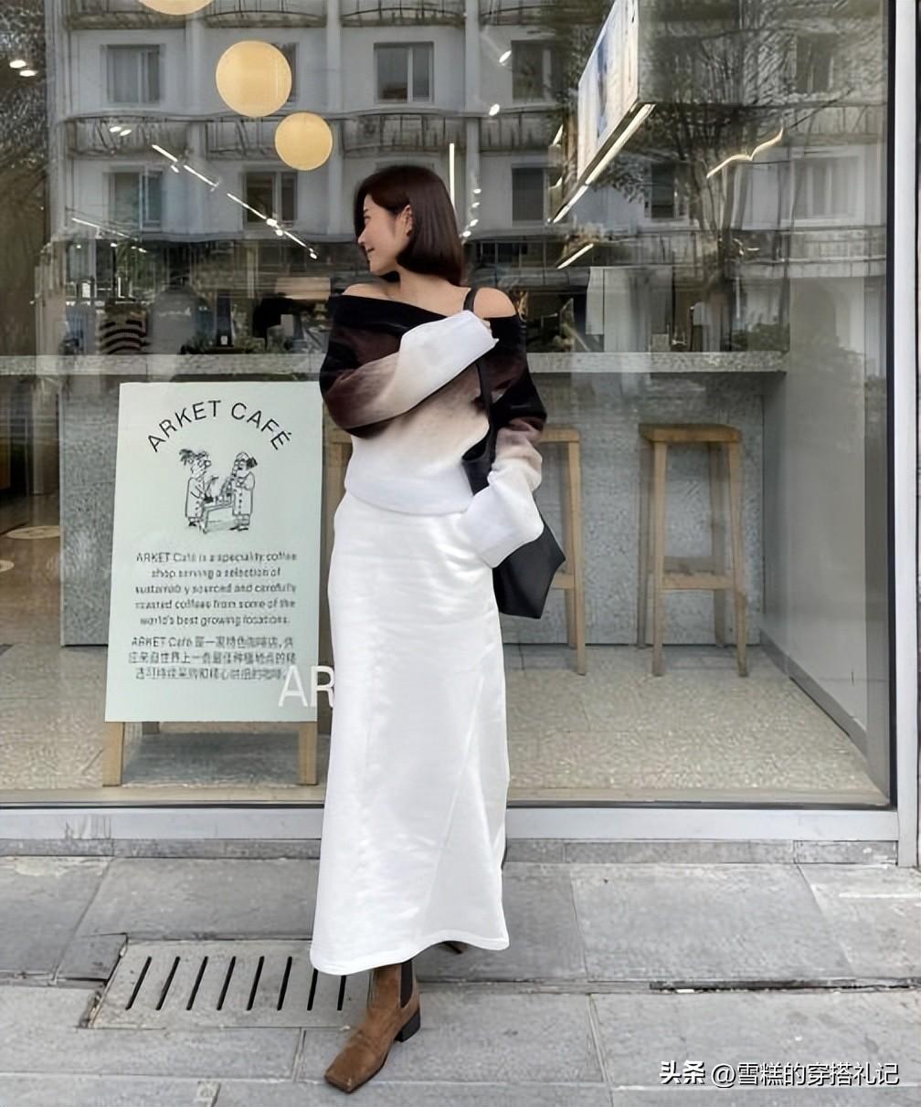 就比如你有優秀的肩頸線條,那麼你就適合露肩,一字肩或者斜肩設計的單品都可以用來搭配半裙。
