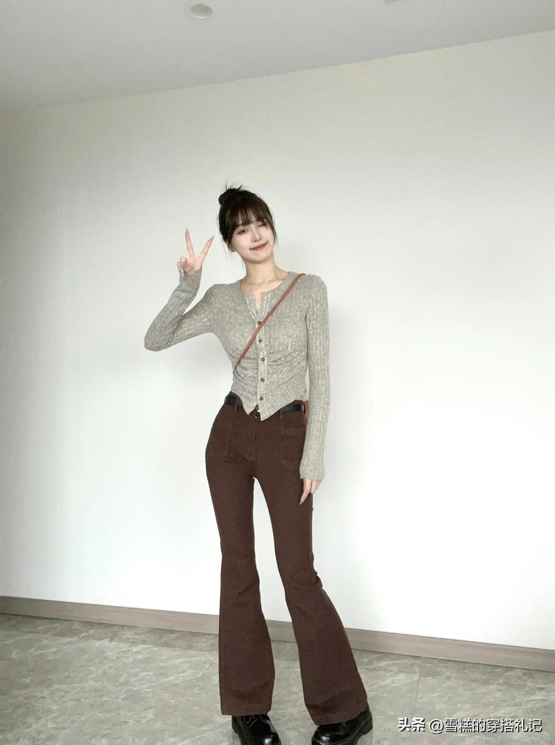 說到長短的組合,就不得不拿出王牌款“酒杯褲”了,那就是帶着深棕色調的燈芯絨長褲系列!作爲秋冬的主打色,深棕色搭配柔軟立體的燈芯絨面料,穿在身上瞬間有復古摩登的效果,更何況咱們還是一個類似於喇叭褲的版型,即使上半身搭配的是最基礎的純色長袖,就已經很好看了!