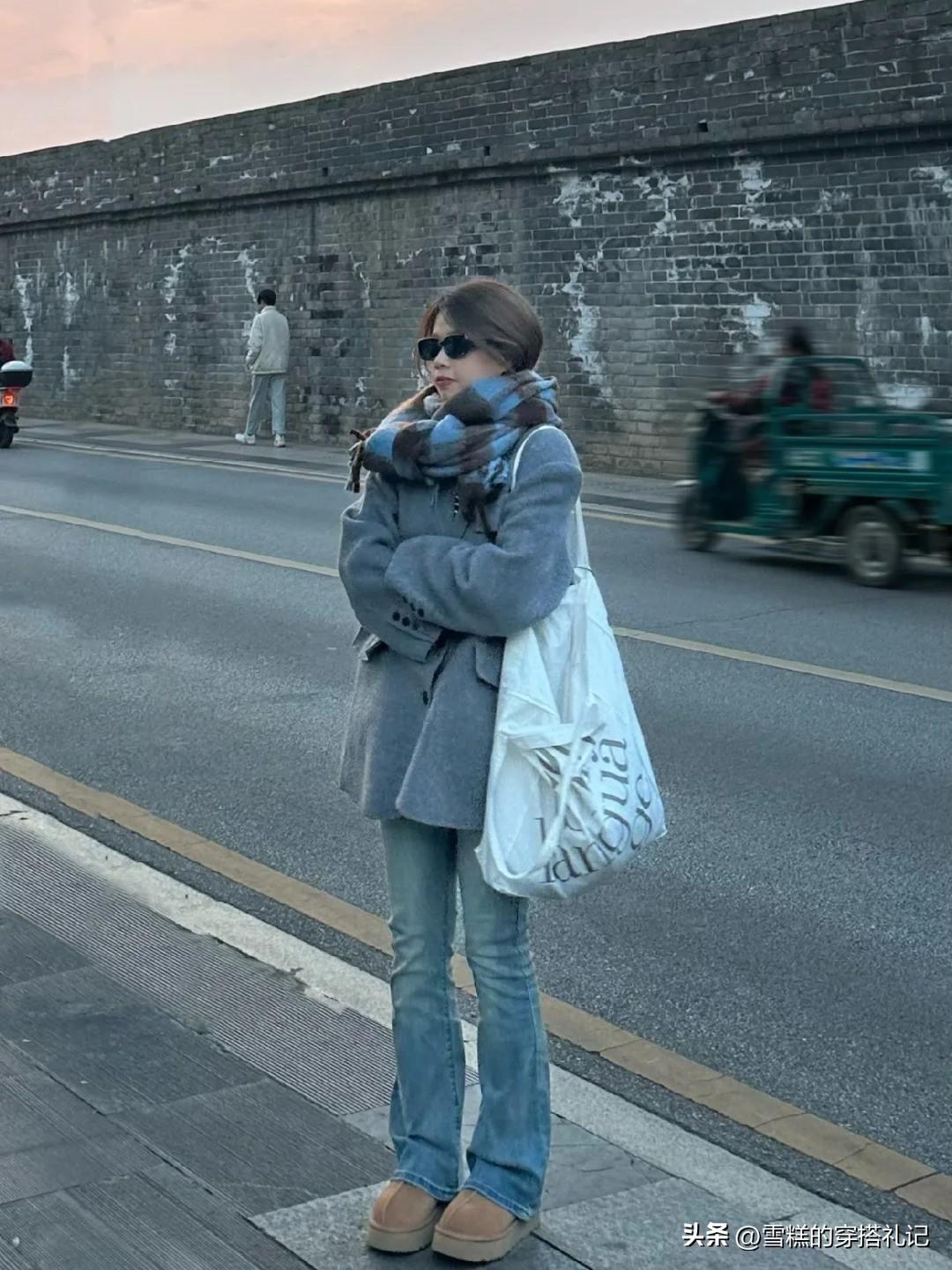 →單品推薦:寬鬆毛呢短外套+淺色牛仔型“酒杯褲”