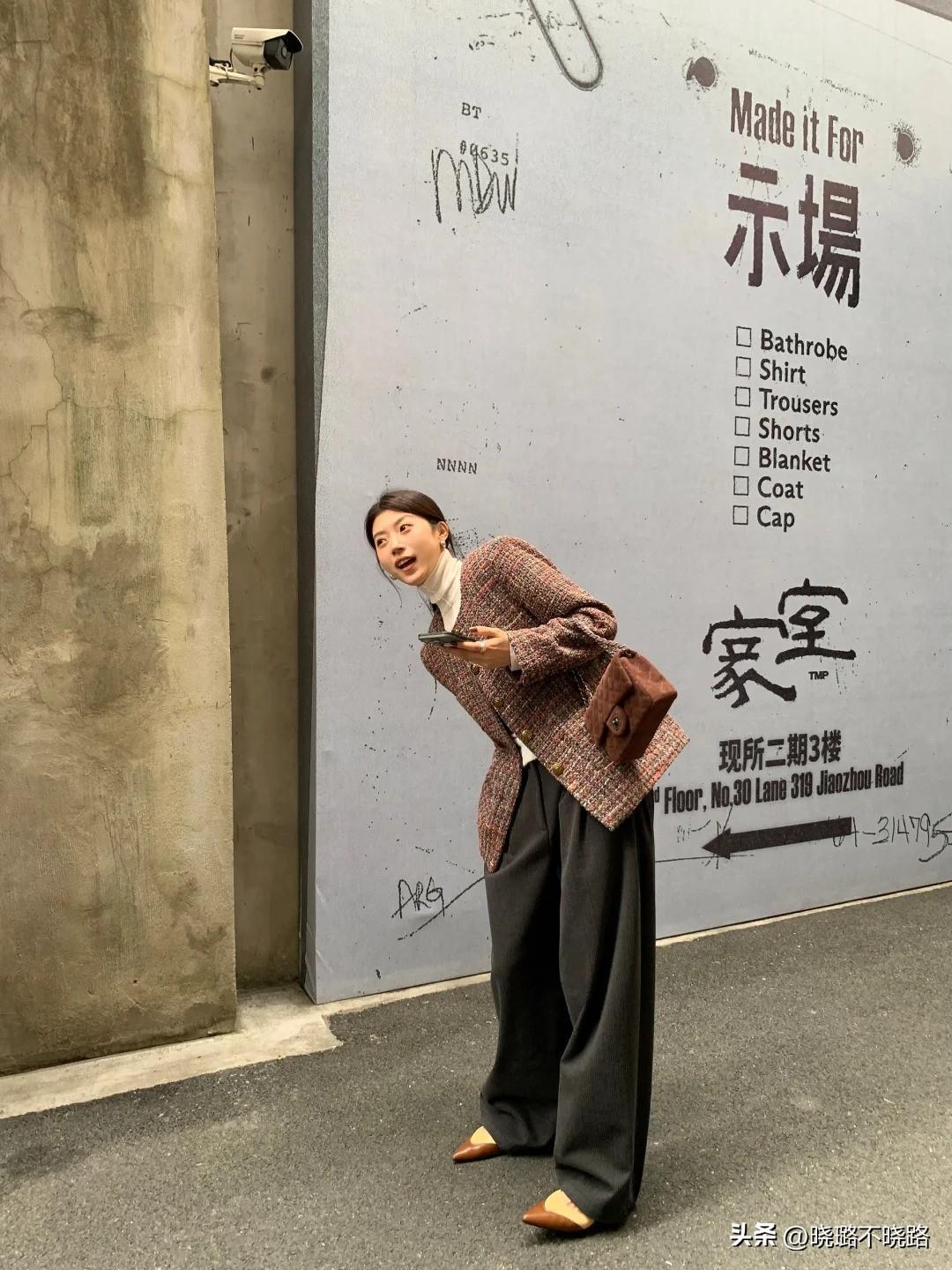 穿搭示範:高領打底衫+棕色小香風外套+闊腿拖地褲