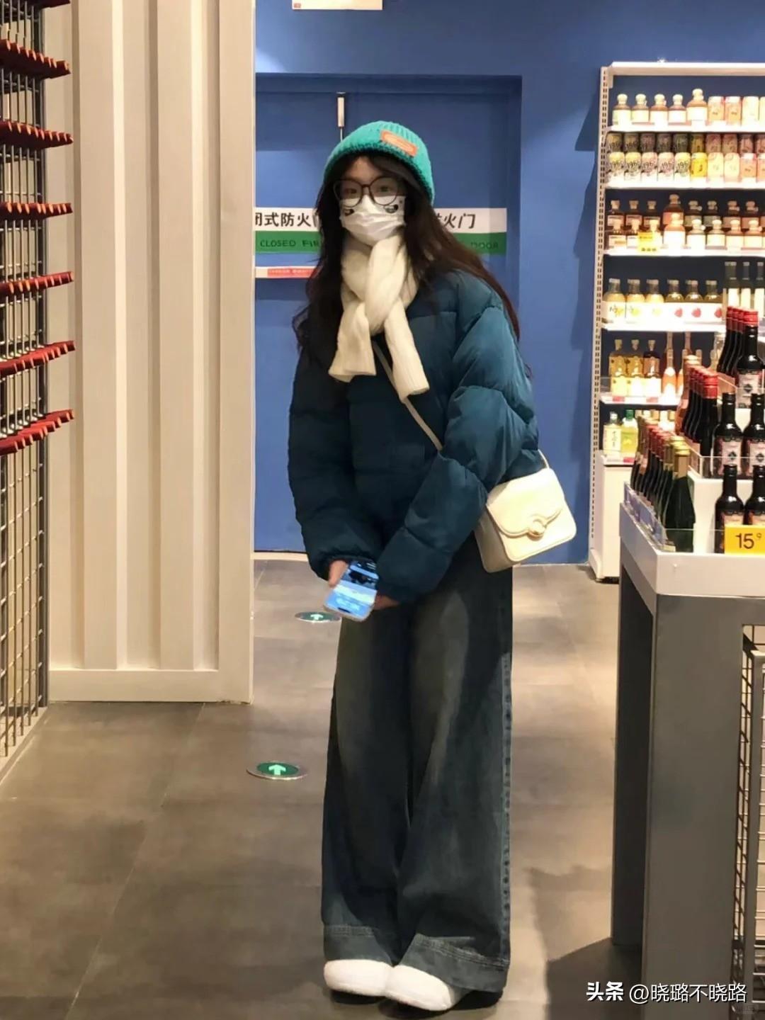 穿搭示範:連帽針織衫+短款黑色短棉服+牛仔直筒褲