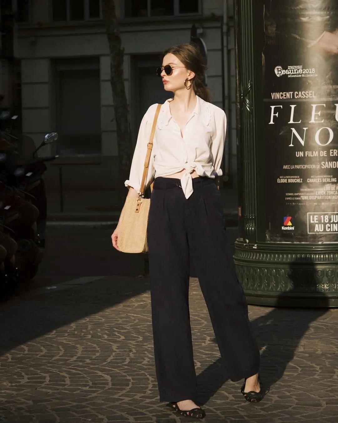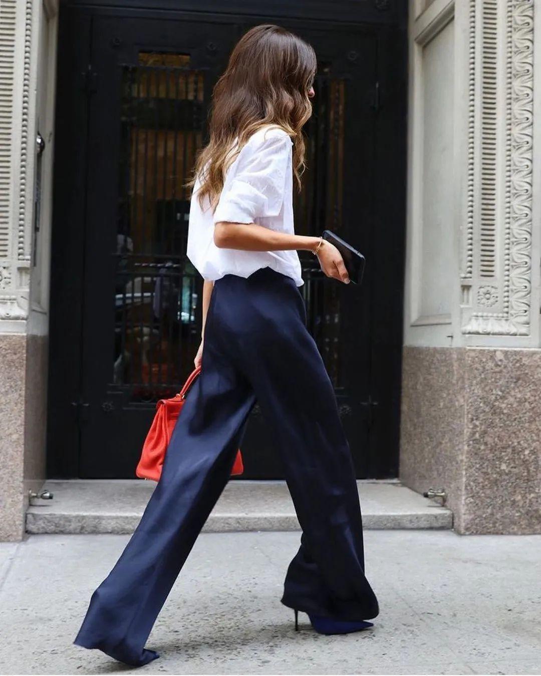 這樣的配色不僅僅是經典耐看,還很簡潔大方,垂墜感十足的闊腿褲與基礎的襯衫,若是再加上一雙高跟鞋的話,就將大女人風演繹得淋漓盡致了。