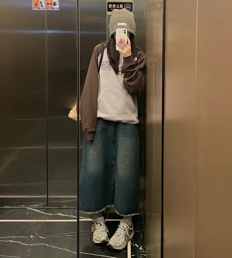 這身很韓也很時髦,溫溫柔柔的,慵懶又不失休閒,寬鬆字母衛衣+魚尾牛仔半裙+運動鞋,舒適自在還減齡。