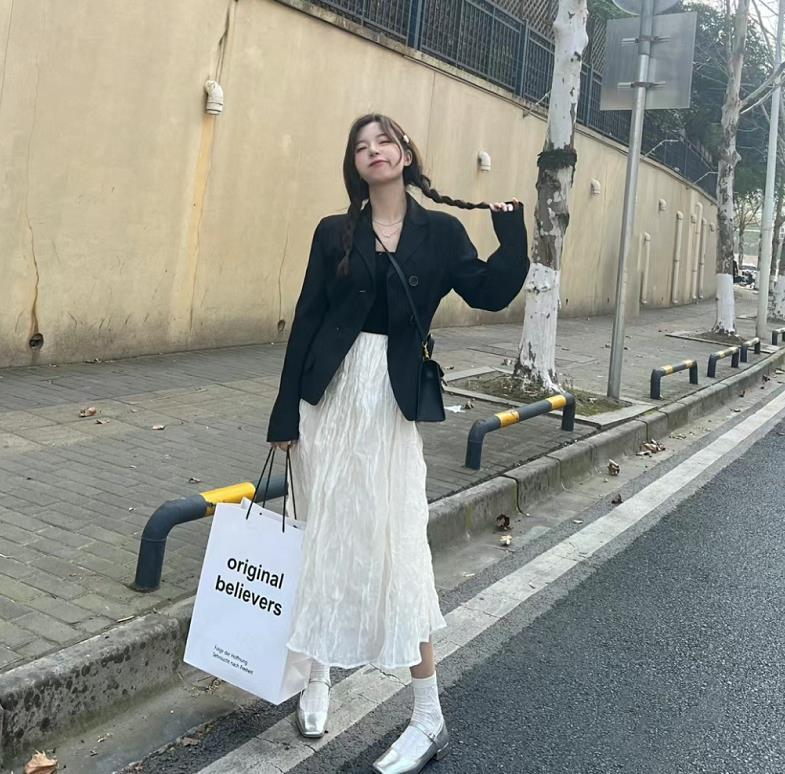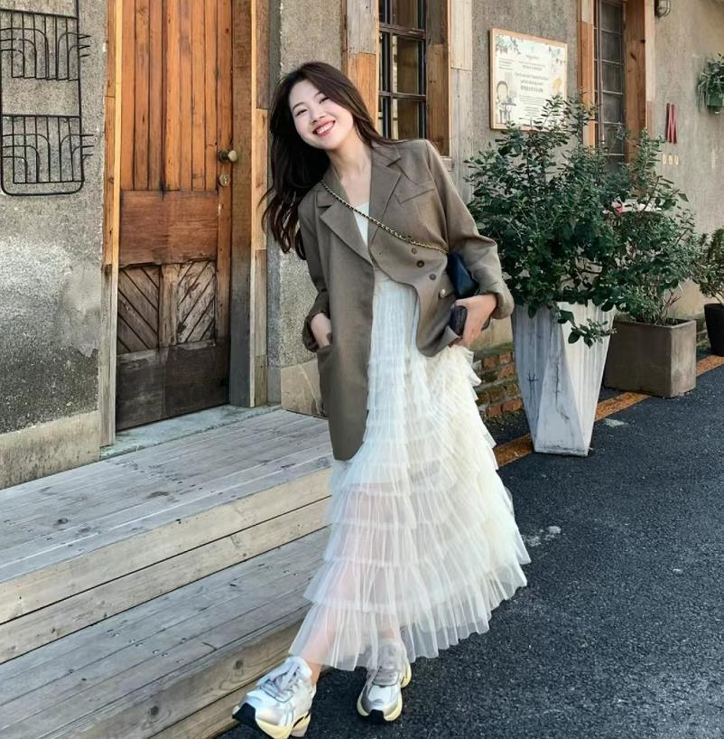 西裝搭配白裙子意外的好看,輕紗材質的白色半身長裙,穿起來很輕盈唯美,再混搭起一雙運動鞋,又爲整個着裝增加了幾分休閒和舒適。