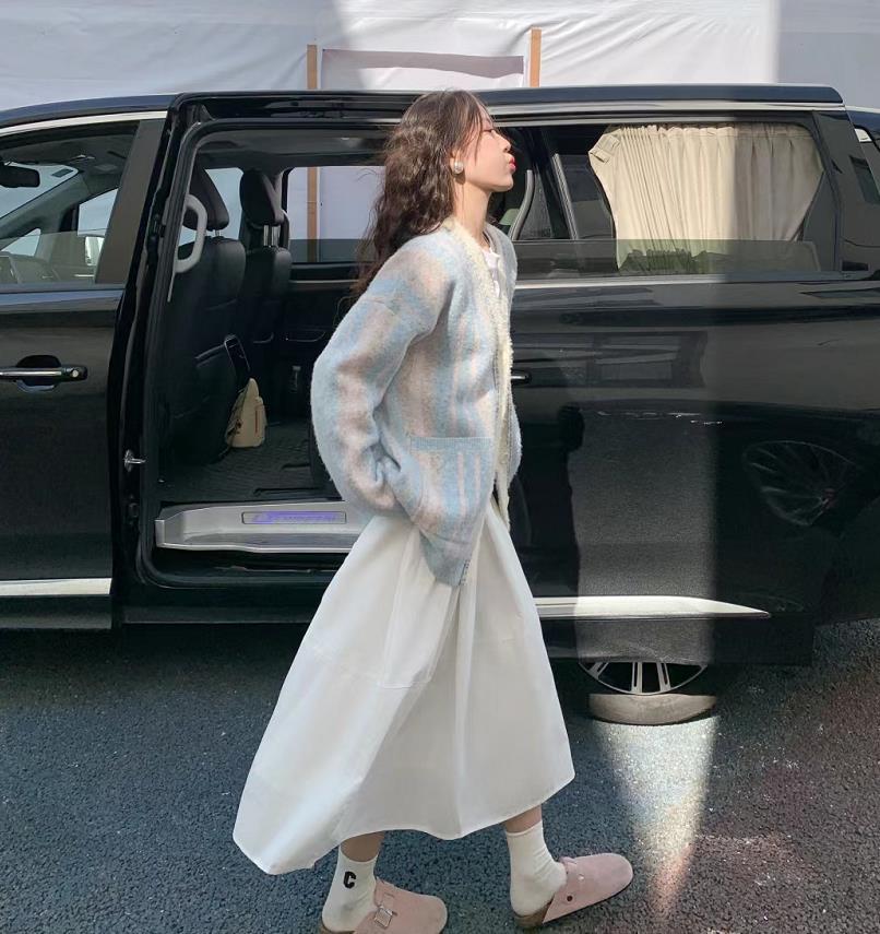 帶點復古範的一套穿搭,格紋西裝外套+白色連衣裙,這也太好看了吧,因爲仙女裙的搭配,讓原本嚴謹正式的西裝變得時髦起來,整體也多了幾分少女風。