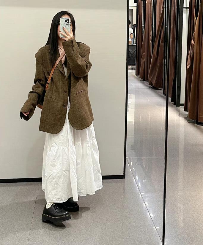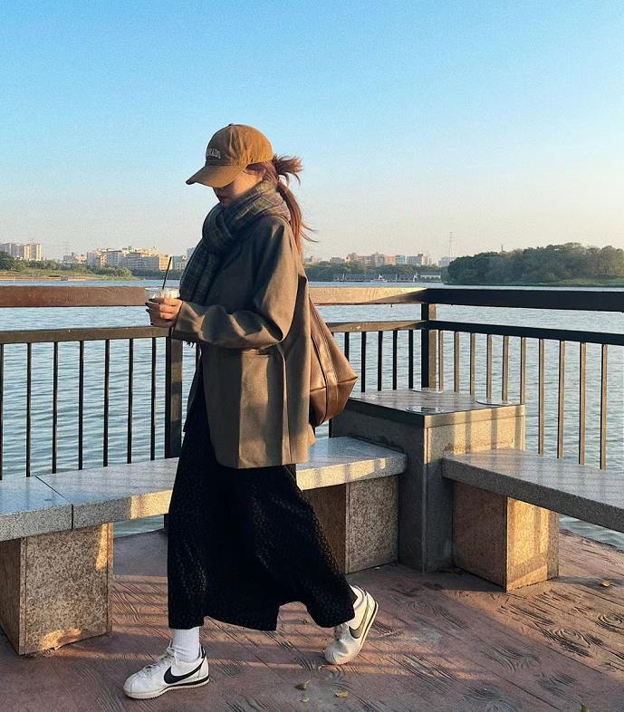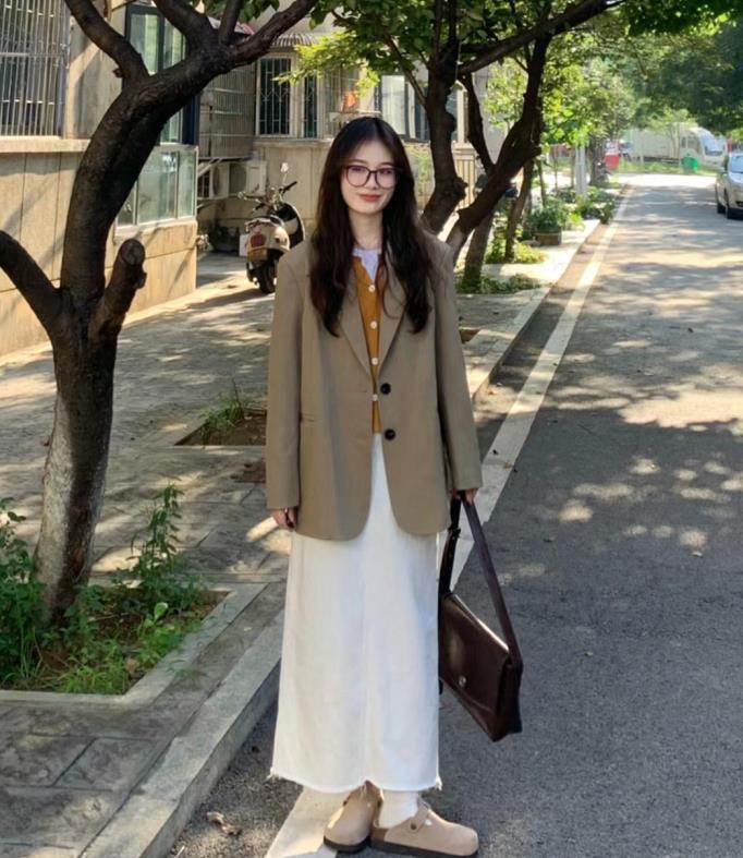 西裝搭配長裙也太有氛圍感了吧,不得不說的是這樣搭配起來好韓系啊,乍暖還寒的季節,出門增加一些配飾點綴,例如帽子、圍巾等。