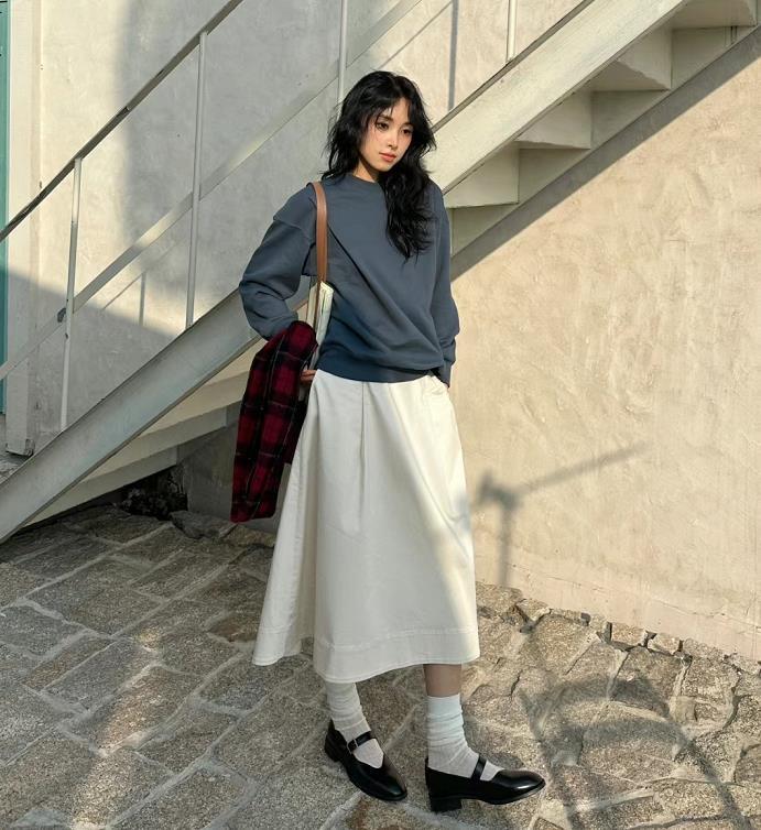 春天的穿搭,簡簡單單就很漂亮了,基礎款衛衣+半裙,顏色是灰和白,不得不說真的超級耐看百搭的。腳上穿着的白色襪子,與裙子進行了呼應,黑色瑪麗珍單鞋更添幾分乖巧和甜美。